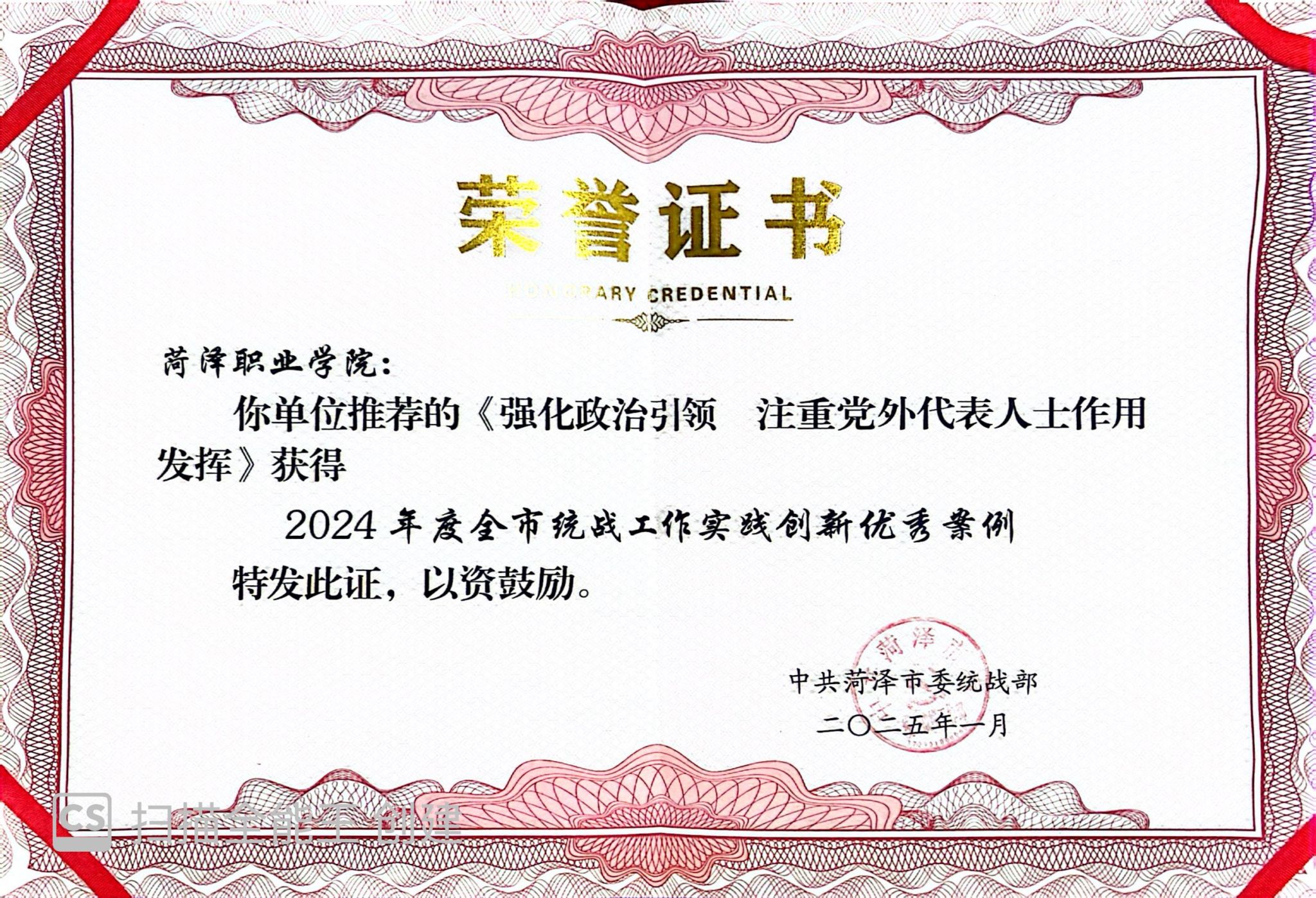 近日,从菏泽市委统战部传来喜讯,在市委统战部组织开展的“菏力同心 携手奋进” 统战工作实践创新案例征集评选活动中,威尼斯官网报送的《强化政治引领 注重党外代表人士作用发挥》荣获优秀案例。这一荣誉的取得,是对威尼斯官网统战工作的高度肯定,彰显了威尼斯官网在统战工作中的创新探索与突出成效。