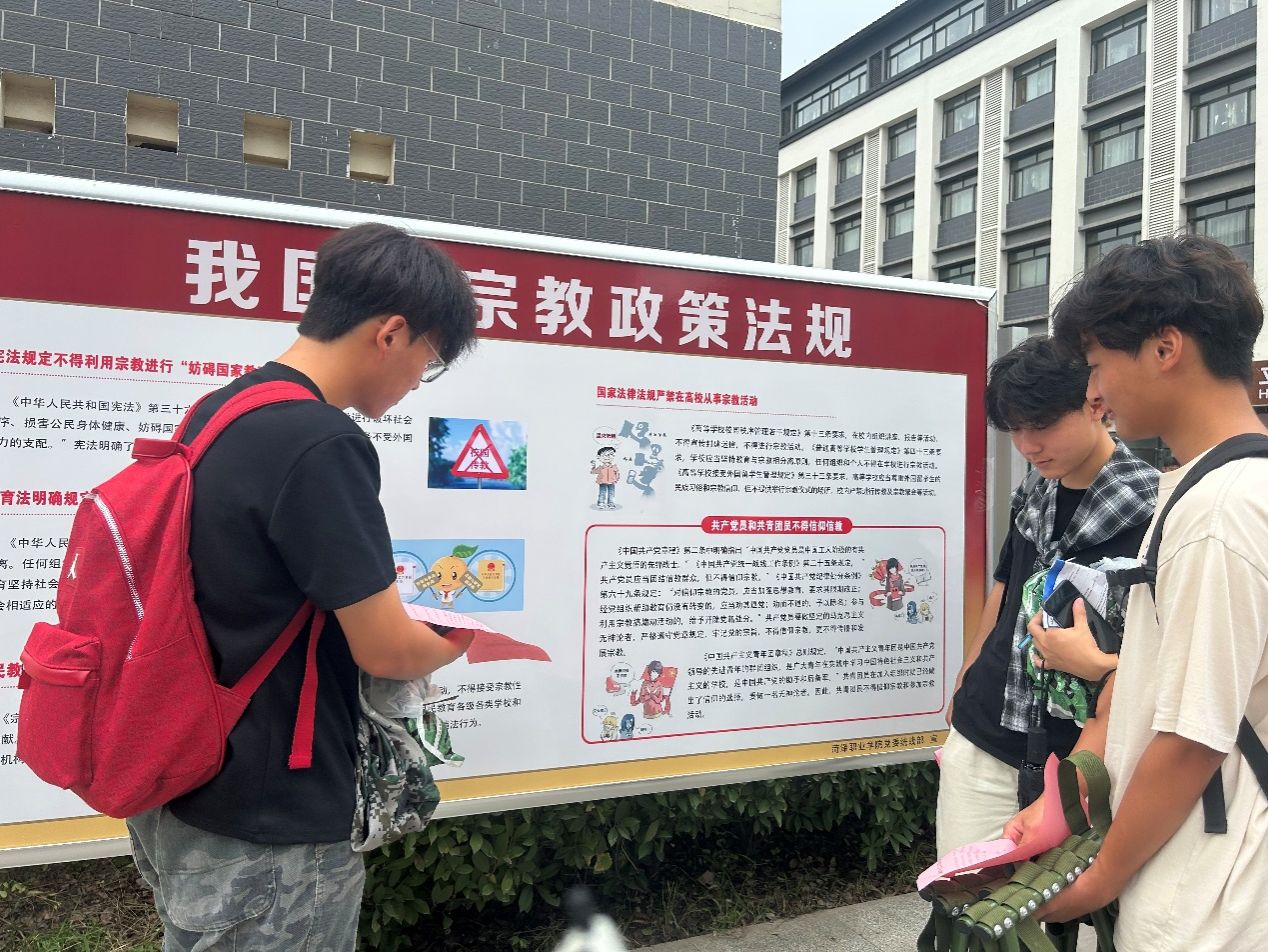 在新生报到现场,两幅设计精美、内容详实的民族宗教政策法规宣传展板吸引了众多师生和家长的目光。展板系统展示了党的民族宗教工作基本方针和法律法规:我国《宪法》规定“不得利用宗教进行妨碍国家教育制度的活动”,《教育法》更是明确规定“国家实行教育与宗教相分原则”,《普通高等学校学生管理规定》要求“任何组织和个人不得在学校进行宗教活动”。共产党员和共青团员不得信仰宗教;新时代党的民族工作的主线是铸牢中华民族共同体意识。